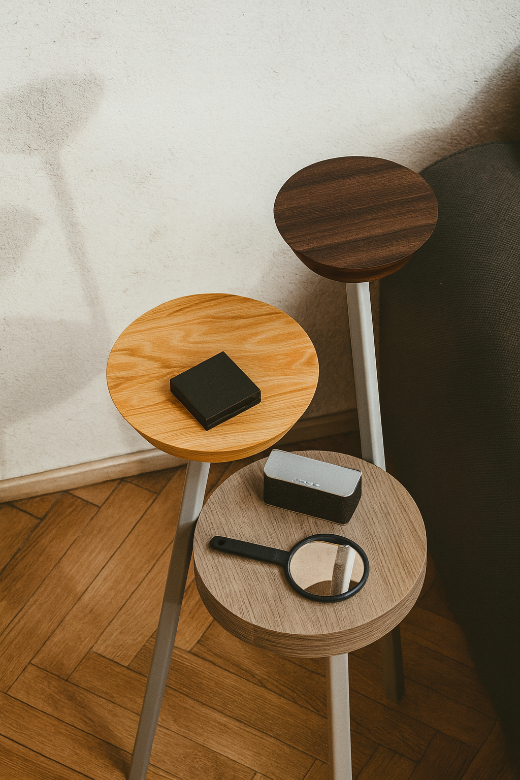 Modified - "The Circus Table was created by thinking about what a product does, not what it is. If you ask someone to design a side table they might draw four legs with a flat top in a range of styles. When you think about what a side-table does it holds possessions like TV remotes, family photos, keys, wallets and phones - so why only have one surface for those uses?"